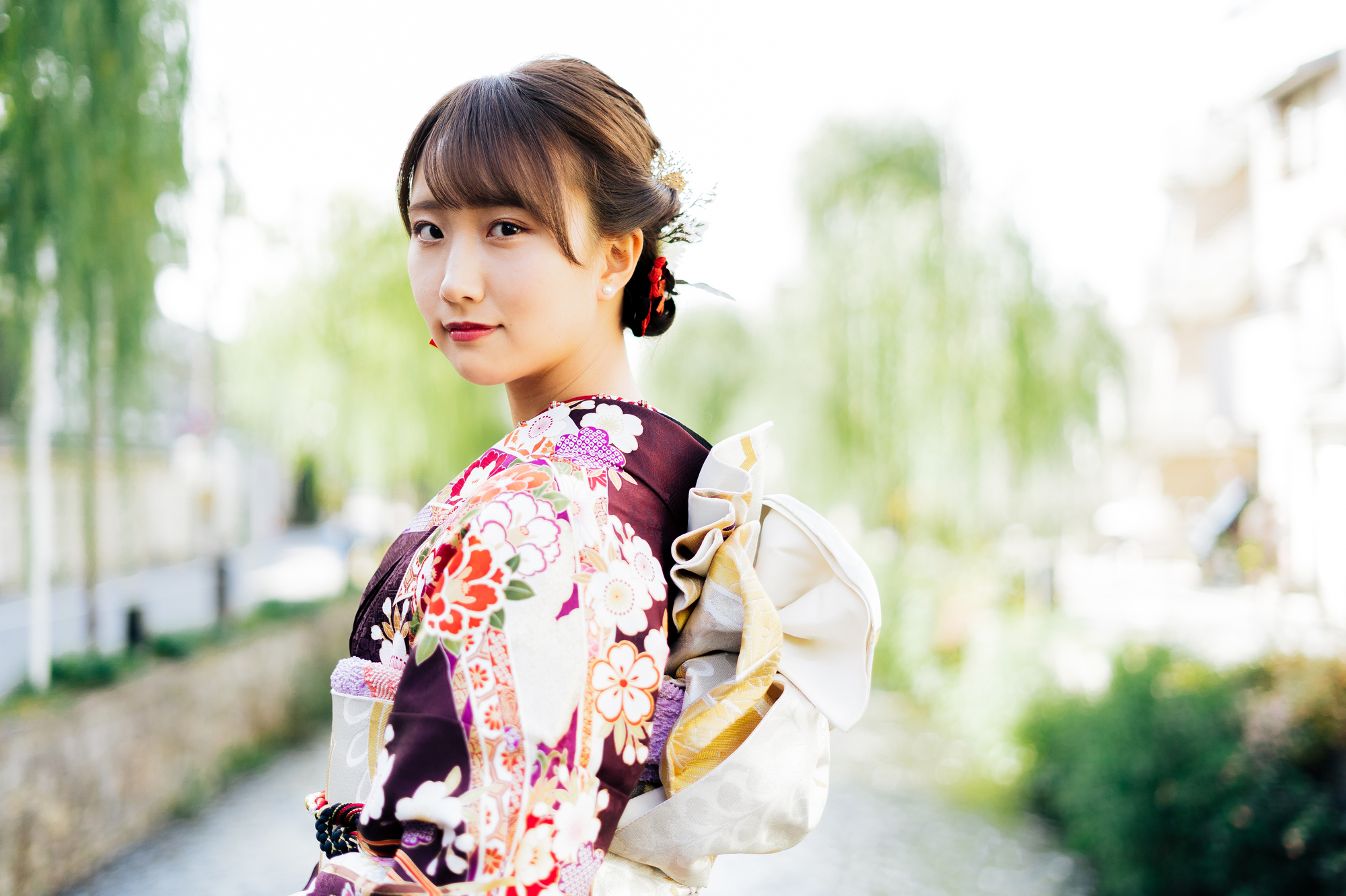 振袖の袖を広げたり、歩きながら振り返るポーズは動きが出て自然な写真になります。和傘や扇子、花飾りなどを使うと春らしさが加わり、写真に物語のような雰囲気が生まれます。